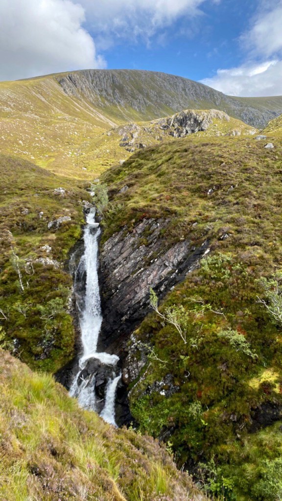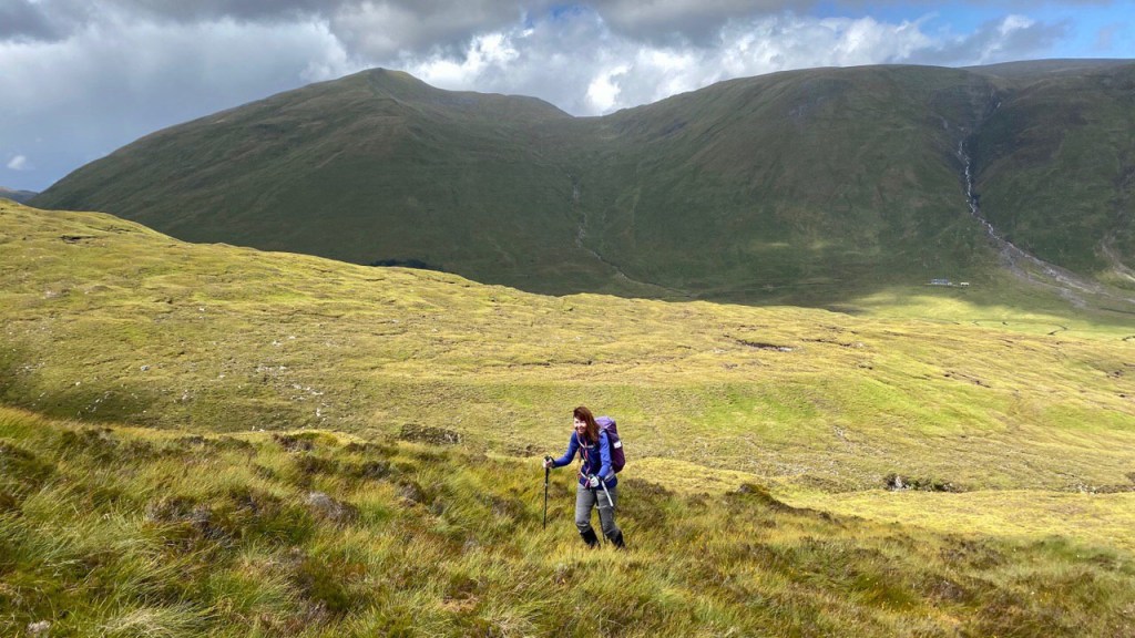 As it transpired, we took our own route, heading more directly towards Glenuaig Lodge and Bothy than we should have. This incurred an extra couple of water crossings, one where we created our own stepping stones to avoid getting too wet as the water was flowing well, another where Bruce decided to lie down (ok, he slipped); there’s a reason why he’s made to go first!