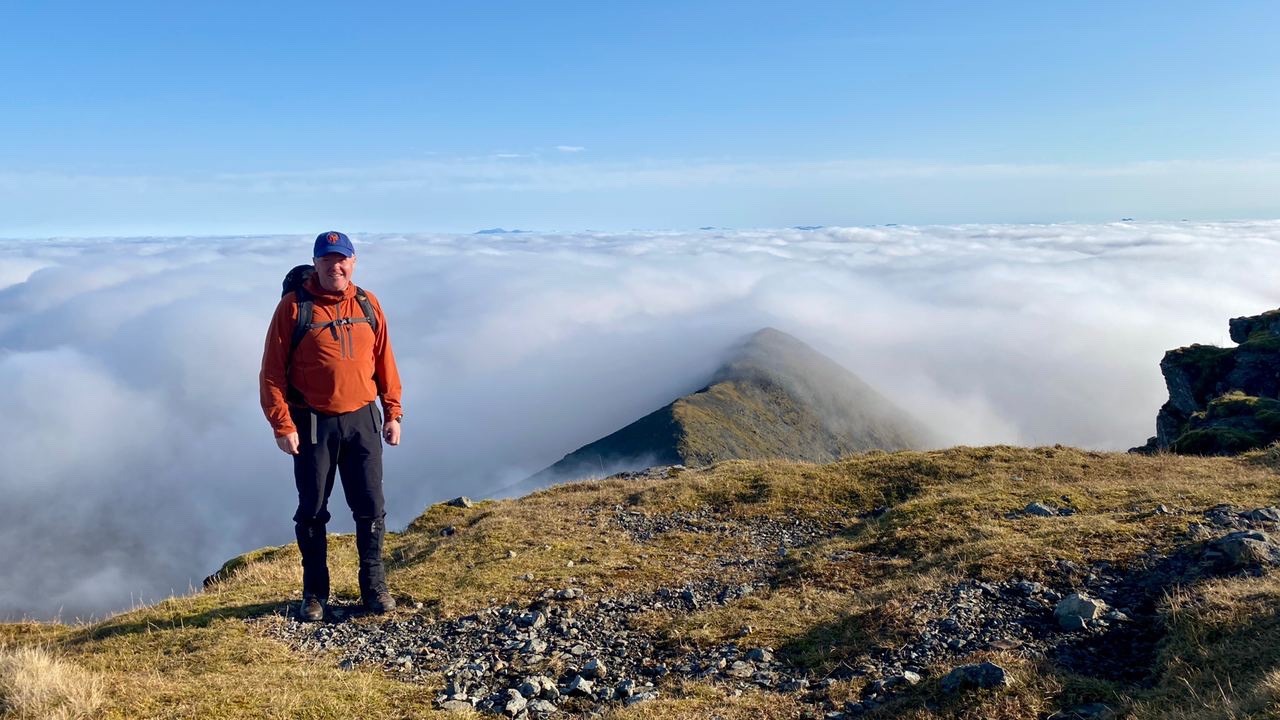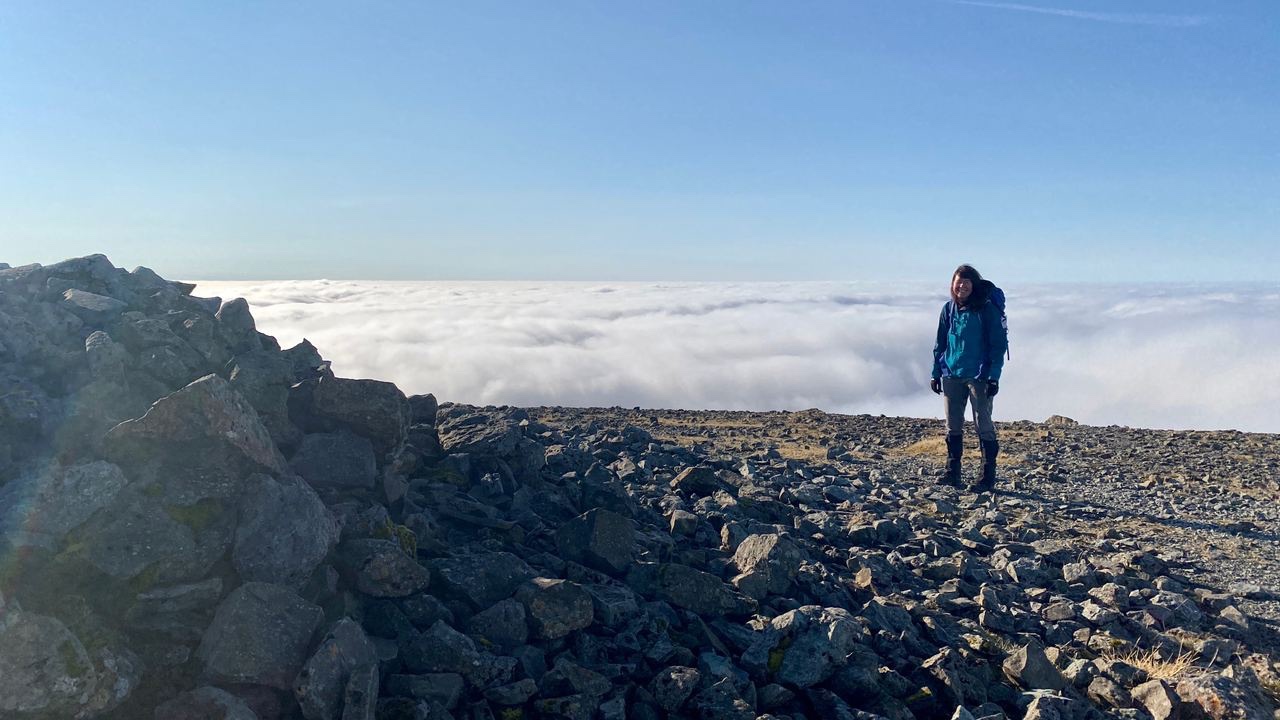 This may be why the final pull up to the summit seemed effortless. The slope steepened, the zigzagging path continued meandering up and before we knew it we’d reached the second last cairn – there were many on route – the summit cairn visible across an almost flat plateau. We were now high above the cloud. Through the inversion we could see some of the higher peaks peeping through – Ben Nevis and Ben Cruachan particularly standing out. This also gave great joy and made up for the lack of other views.