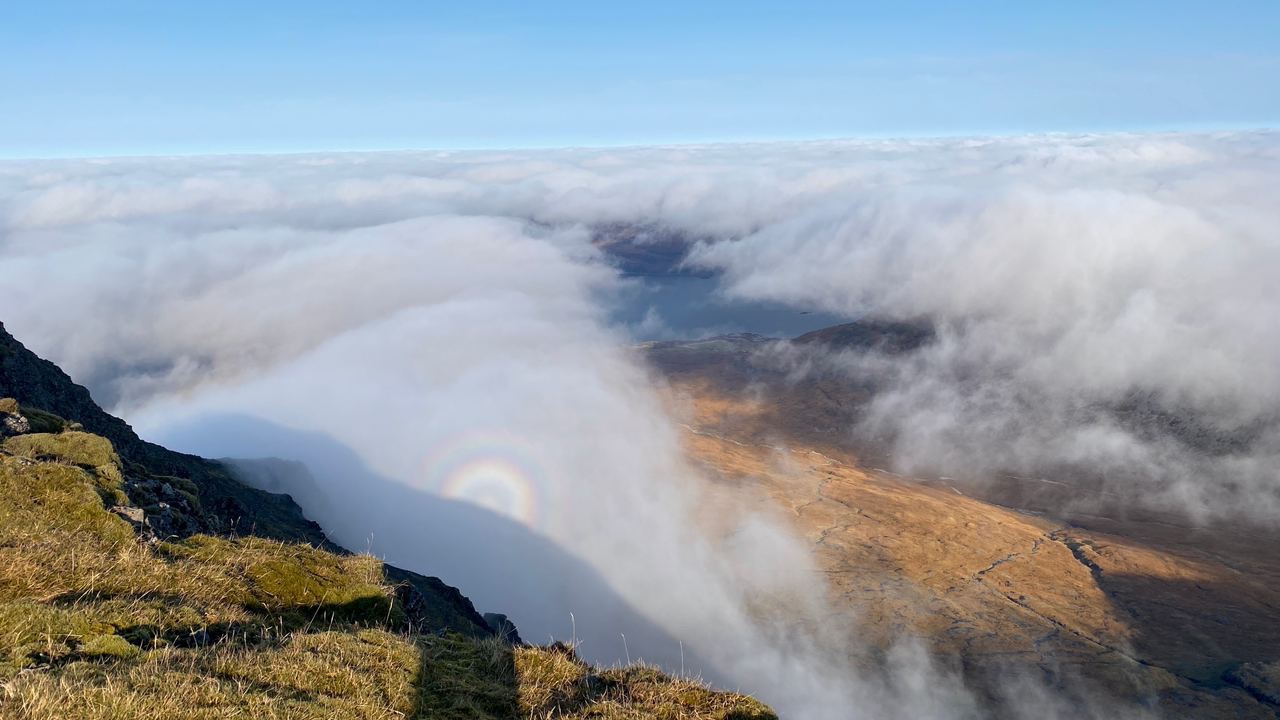 As height was gained, the cloud shrouded the summit of Ben More and it could only just be seen in the shadows. This caused some excitement; the thick cloud, then the full sun melting through as we headed up the zig-zagging path. We realised we may be in for an inversion; Bruce suggested that the right conditions could also give us a Brocken Spectre, something I had a vague notion of but further explanation was required: BBC Brocken Spectre