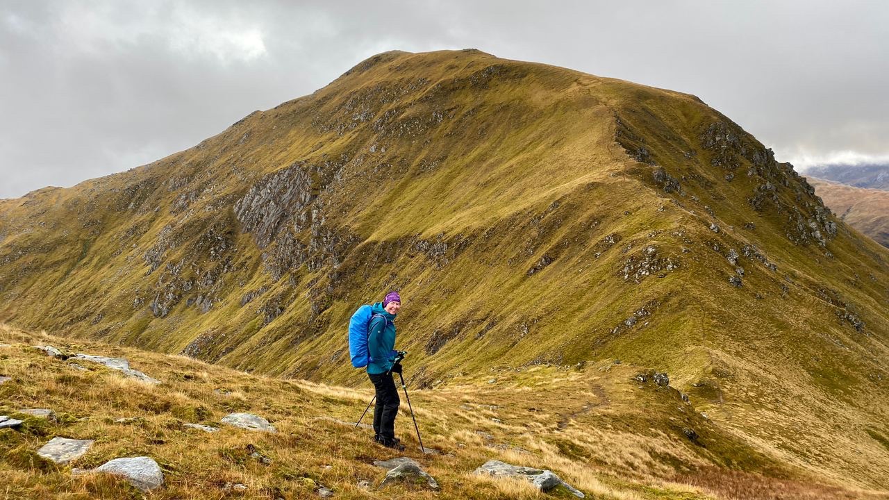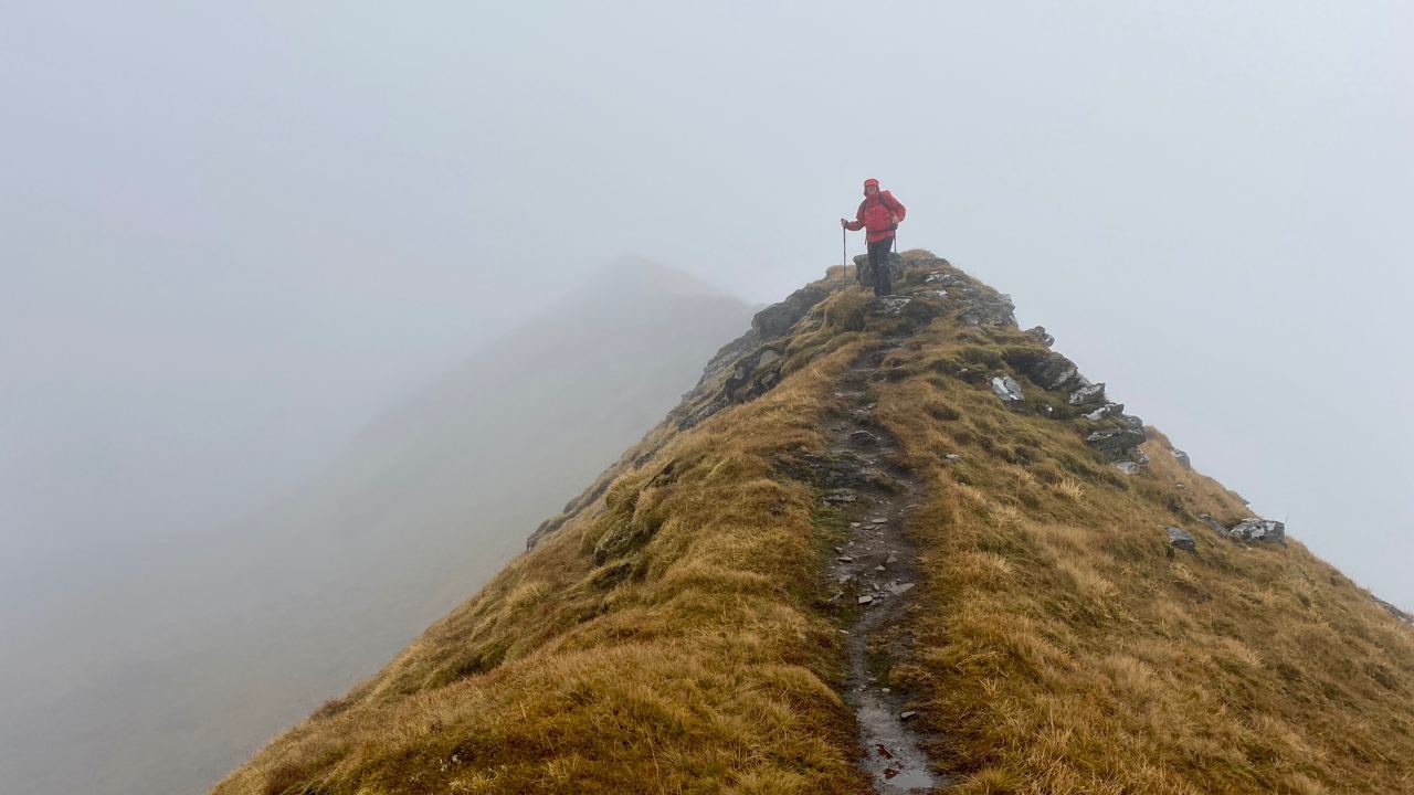 That sealed it. No going back! The ridge was wide and grassy with rocky outcrops. The only concern was wet stone, so careful foot placement was require. My seasoned hill walking companion (Bruce) advised me to use my heel to anchor myself on descent, providing additional security.