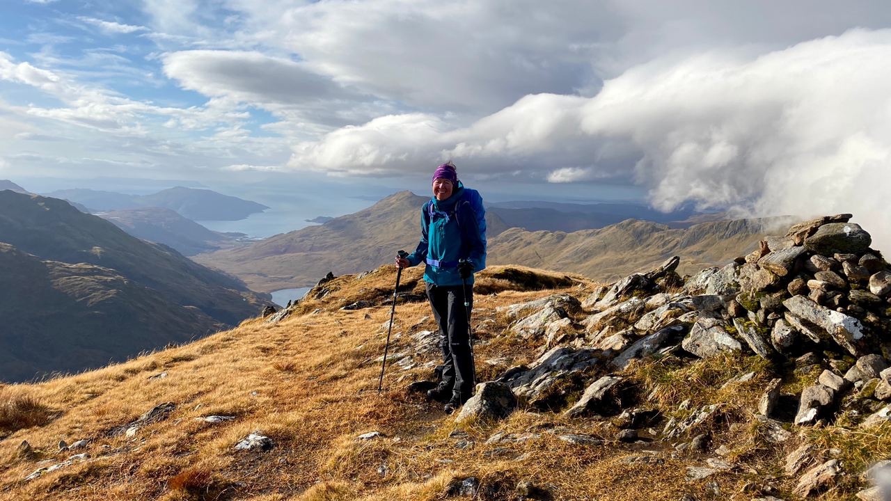 The path continued, leading us round towards an easier slope approaching the eastern top of Luinne Bheinn. A little further up we encountered the scramble. The route guide described it as simple and it was – about the right level for me! Nothing too exposed, a wee bit of a challenge (for me) but again my guide came up trumps, coaching me up and giving tips on hand holds, maintaining points of contact etc. Dare I say it, I think I maybe enjoyed it.