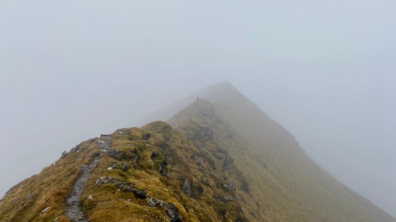 We expected the next section, the ridge leading up to Ladhar Bheinn, to be tough, but were pleasantly surprised! Rather than the rough path we’d experienced it was a grassy slope, the gradient feeling far easier than the lower slope. The only thing left to be wary of was the steep slope dropping off into the mist. We’d lost the path further down so I made sure to stay well away from the steep stuff at the edge.