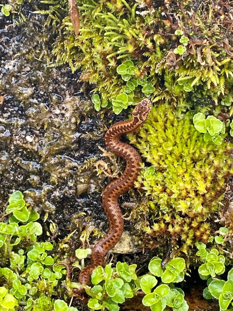 This is my least favourite part of the walk as it seems to take forever, the end of the loch out of sight for some time. Today though, our journey was broken up thanks to a young couple showing interest in a trickle of water coming off the dyke. There we saw a small adder! We were very excited by this and it did us the honour of staying in situ, posing for photos and allowing us a good, close up look.