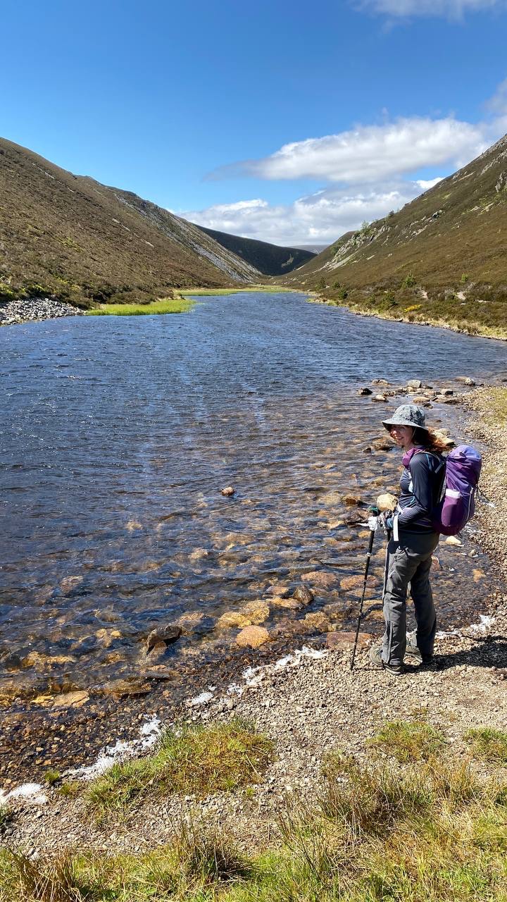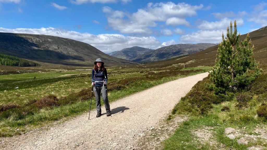 The walking was easy on a very good path, the sun was out with lovely, clear skies, and the scenery was amazing. Views of the surrounding hills abounded and the munros were clear as the day. Beinn a’Bhuird was particularly impressive, although without my personal mapping tool (Bruce) and the walk guide I’ve have been none the wiser which hill it was, such is the way my brain works.