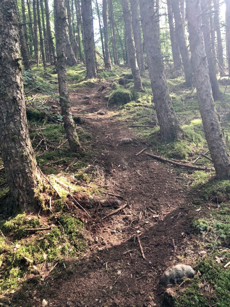 Further on, the path narrowed to a single track. This was overgrown in places with ferns needing trodden out of the way, pines scratching me and some stones and boulders underfoot. Again, this necessitated a walk, primarily to avoid tripping. On the upside, the path opened up as I progressed and the feeling of being in the wild was wonderful.