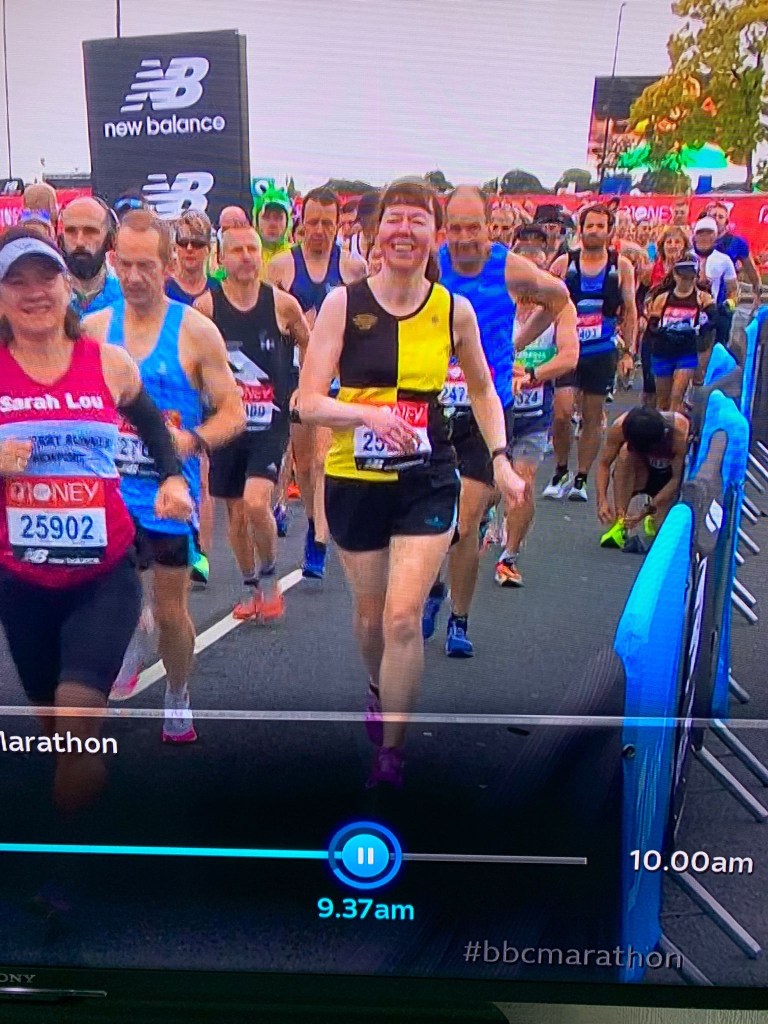 Catching the tube, the train was fairly quiet. I had the good fortune to get seats on all my trains, catching up with a couple of other ladies from the North East (Garioch and Turriff) on the Jubilee Line and heading out to the start with them. The feeling of camaraderie was good, and I also enjoyed chatting to a first time runner on the DLR, offering some words of wisdom and helping to calm his nerves.