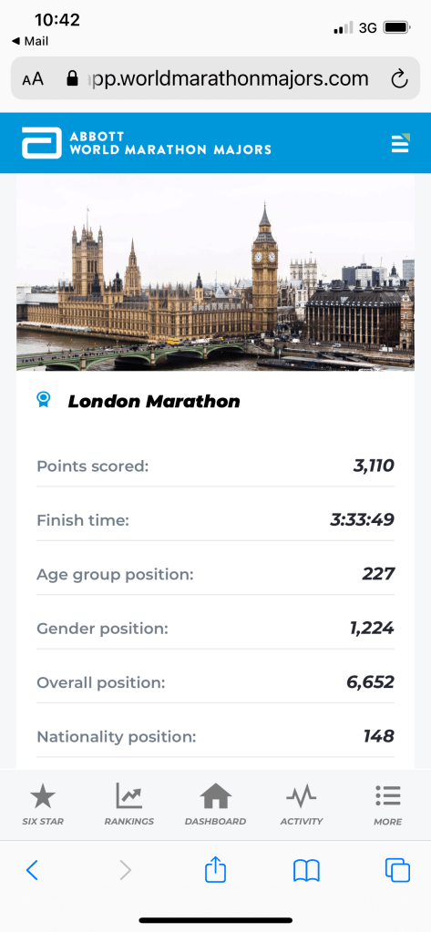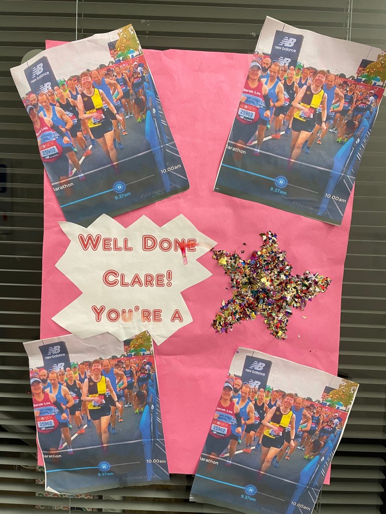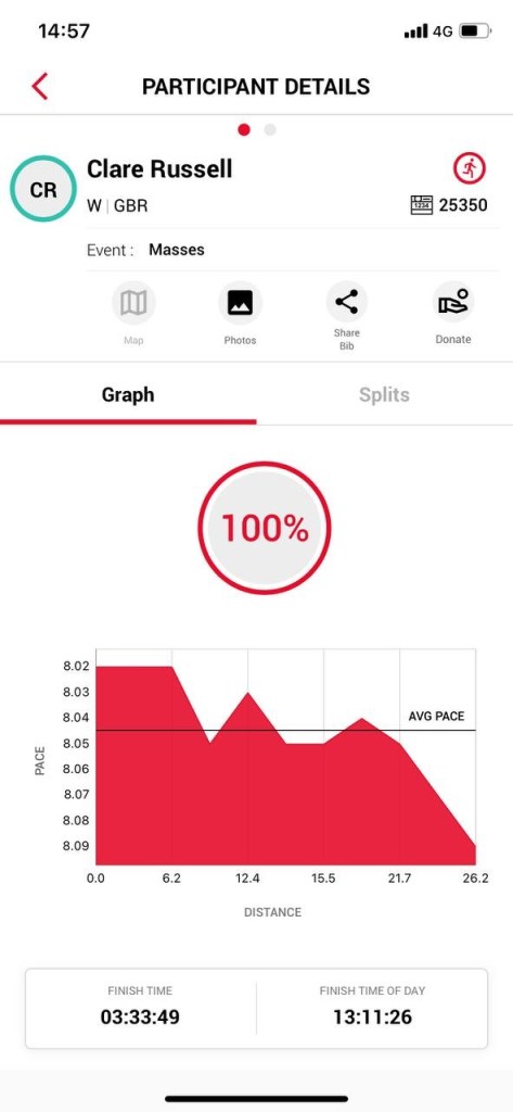 - Training pays dividends – I ran a PB (3:33:49) which was hard won on my 11th marathon (not counting last year’s virtual effort)