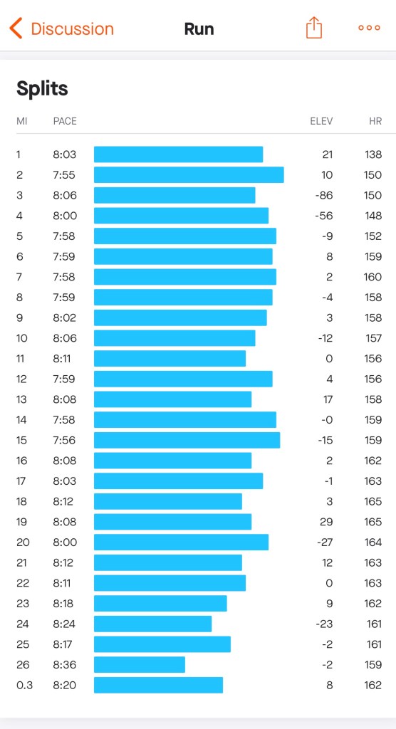 Beyond mile 20 it got harder. I reminded myself that this is what I’d trained for, trying hard to hang onto the pace and not drop off too much. I’d been fuelling every 2 miles until mile 10, but struggled with gels beyond this, even in smaller quantities. I tried to take on small amounts of water when available and continued with little sips of gel here and there.