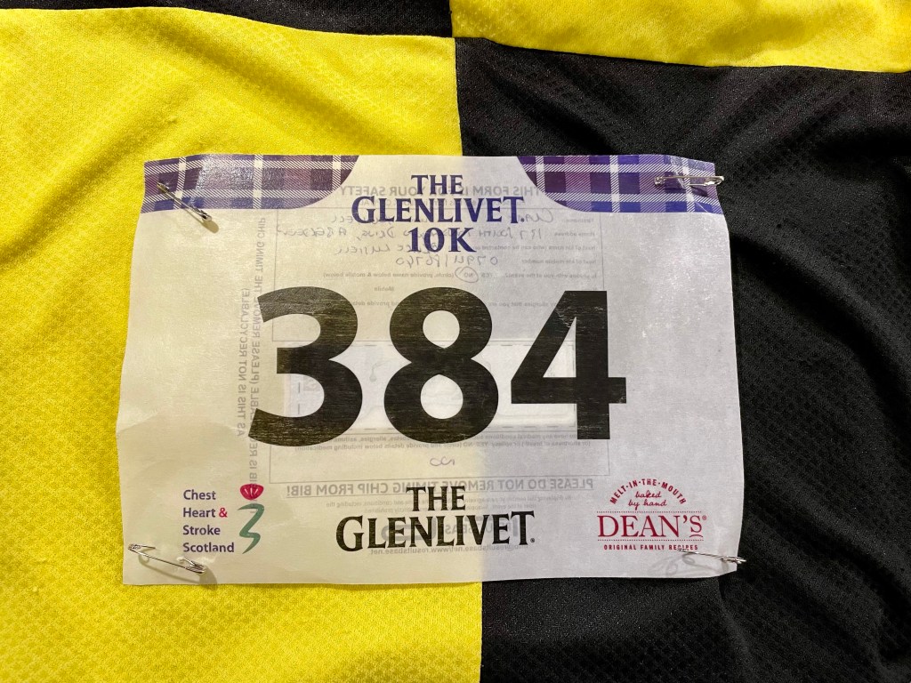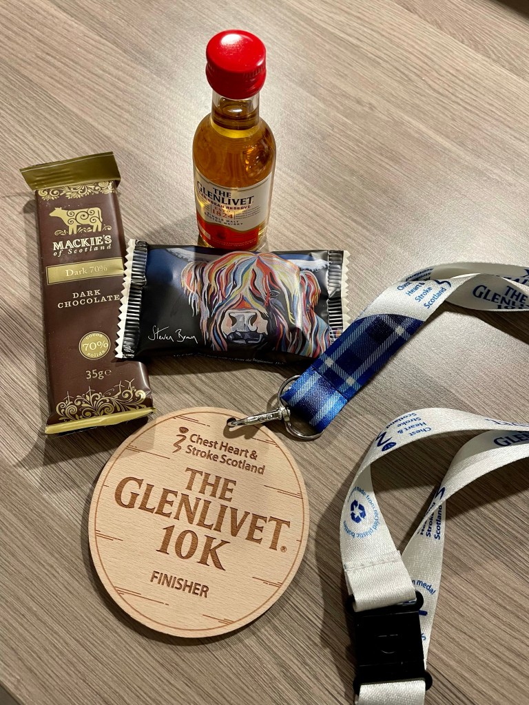 Finally into the last mile and past the Dufftown turn off, I knew it was all downhill. The rain was still pretty light, the distillery was in sight, I was happy! Making the final push to the line, I slowed the pace as I crossed the chip timing mats as the marshal shouted to be careful – they were wet and led down a short sharp rough track so I wasn’t taking any chances! Had a club standard been in sight the story might have been different!
