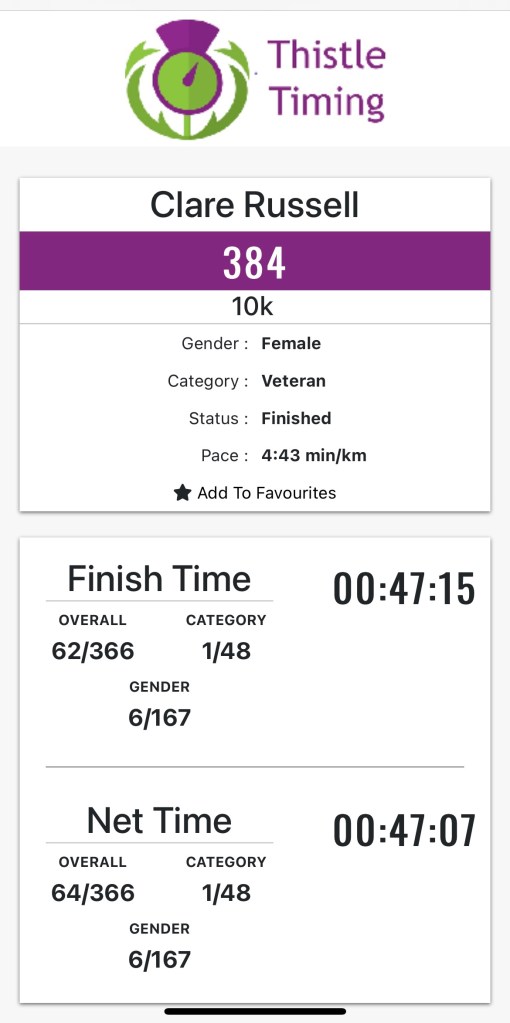 Although as previously stated, I didn’t get the time I’d hoped for, I was happy to finish in 47:07 and even more delighted to find that I was first female veteran. It’s been a while since I’ve made a podium, largely dependent on some talented local ladies taking the day off!