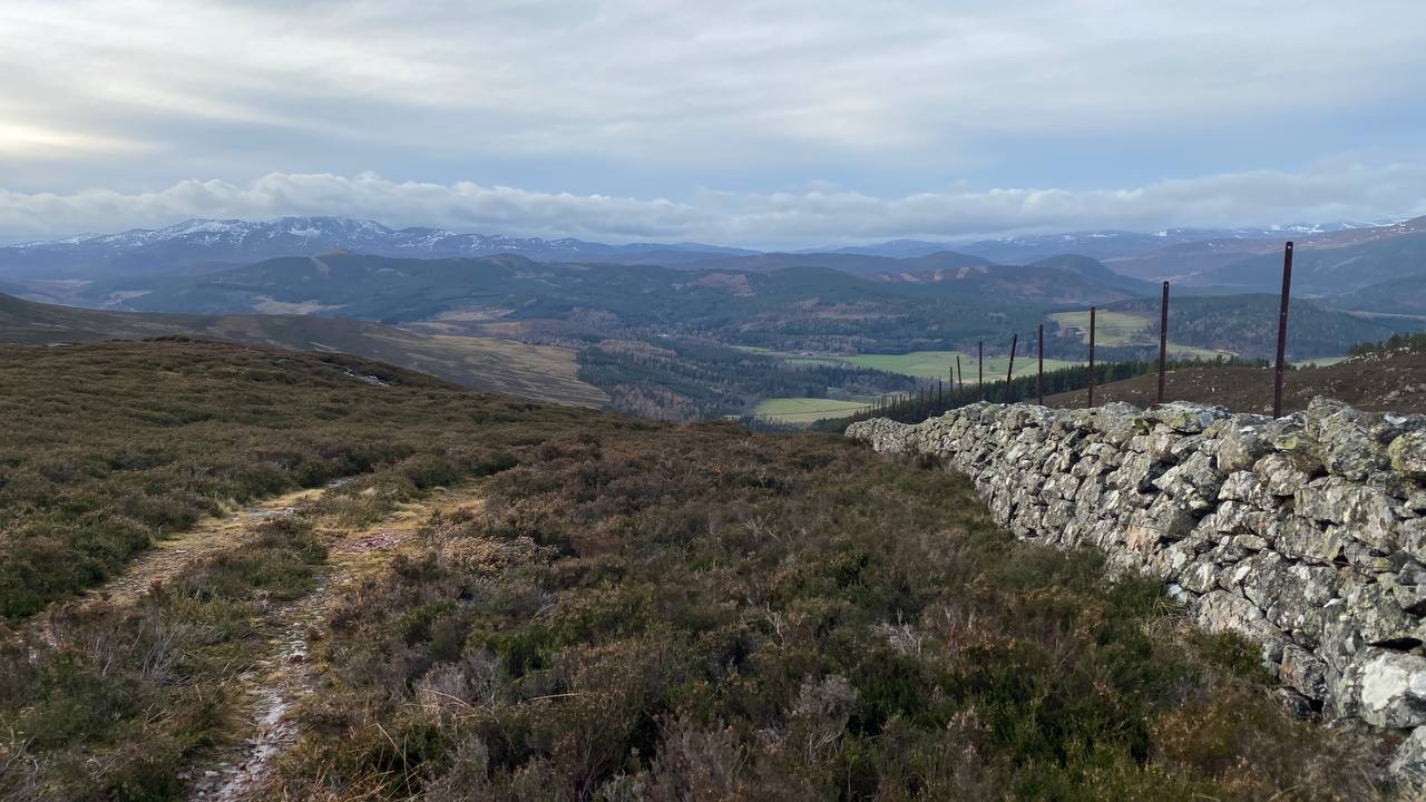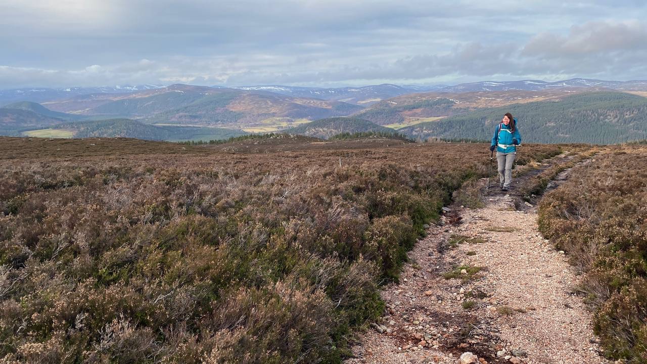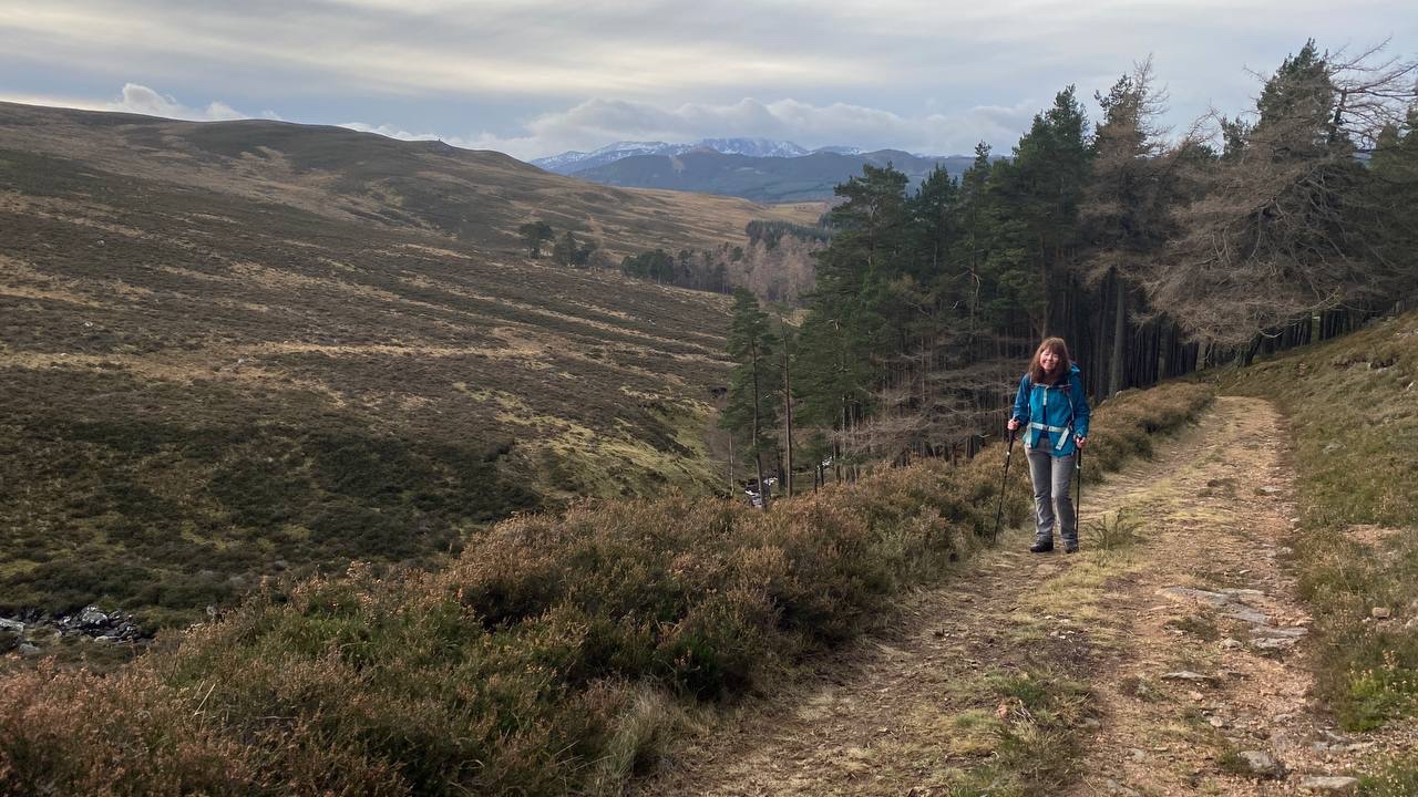 It was worth stopping to look back as the mighty Lochnagar was very majestic in the distance with a dusting of snow covering the higher ground. Beautiful as it was, we were happy with the decision we’d made to stay lower, sheltered from the wind at this point.