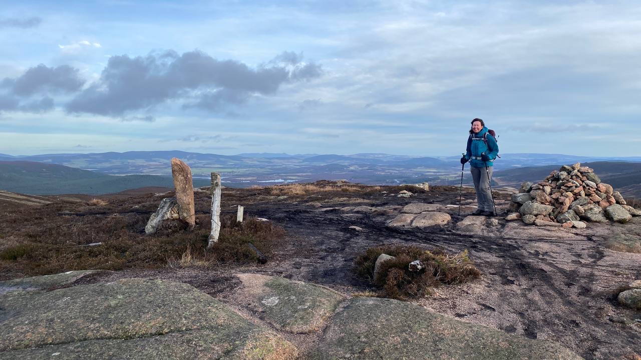 The final gradual path up to the summit cairn and trig point was very exposed and windy! I was grateful that the temperature was unseasonably warm (12C in Ballater) as although blustery and hard going, particularly at the summit, it wasn’t overly cold.