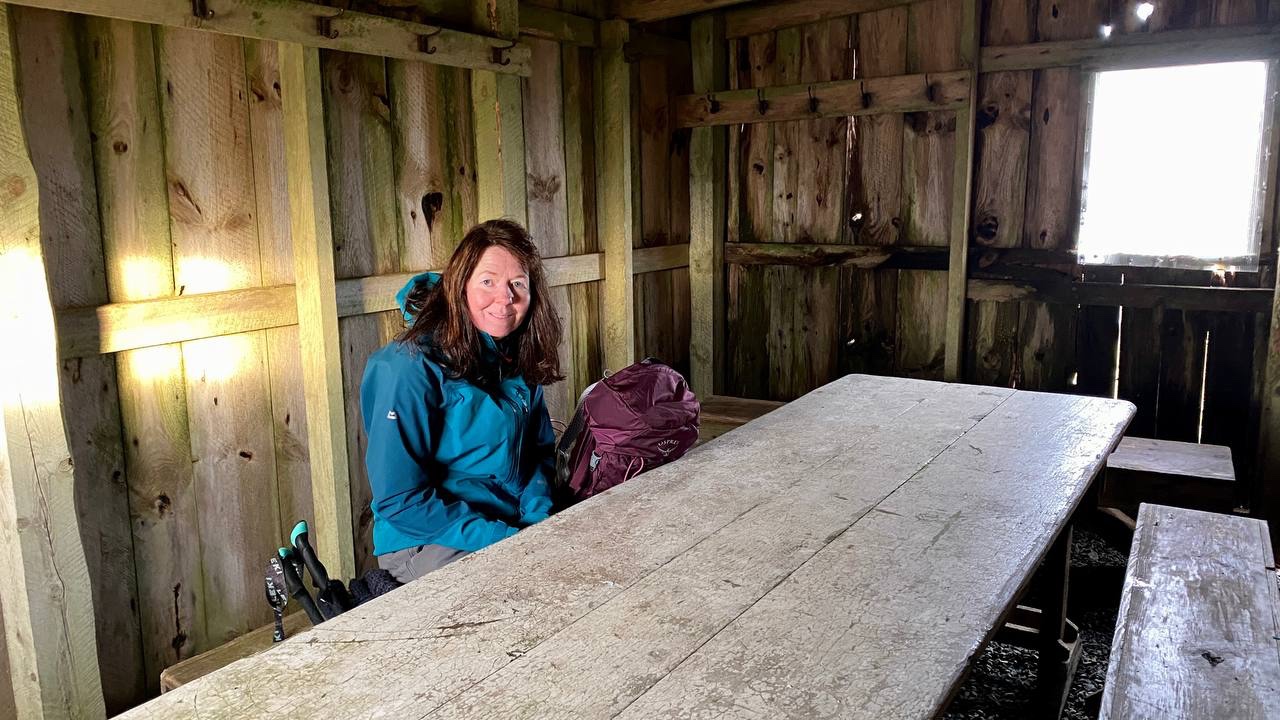 Rather than heading up Craig Vallich, the wind being such that this didn’t hold a great deal of appeal, we skirted around the back of it, stopping off at the shelter before beginning our descent. This proved a fine resting place to have a snack, the wind sounding quite fierce as we sat inside, again drinking in the fine view of Lochnagar from the wee window.