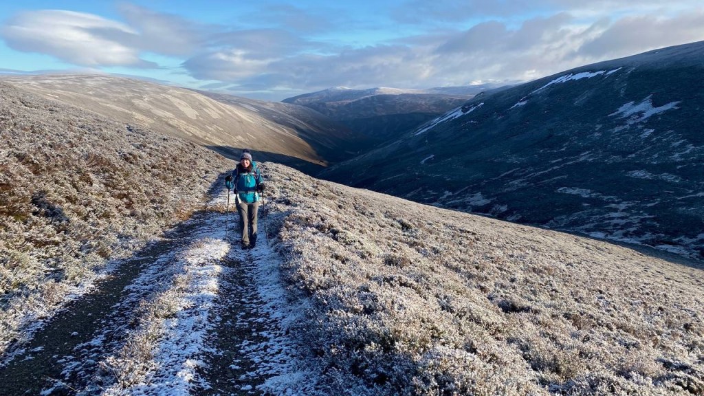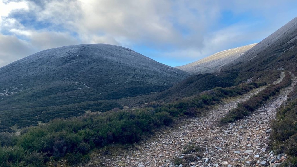 It then continues alongside smaller tributaries, Allt Cristie Mòr and higher up Allt Cristie Beag. The climb is gradual and the track excellent, affording good views back to the Mar Lodge Estate and all around to neighbouring hills.