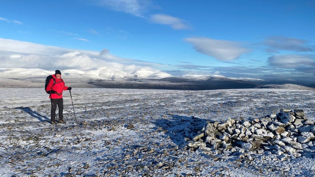 At the top of the glen, a small path headed off towards Carn Liath. It was warm as we moved towards the summit, building heat in our bodies as we progressed. Approaching the summit the views opened up even further and the massive Cairngorm plateau was in view, Bruce naming the mountains for me.