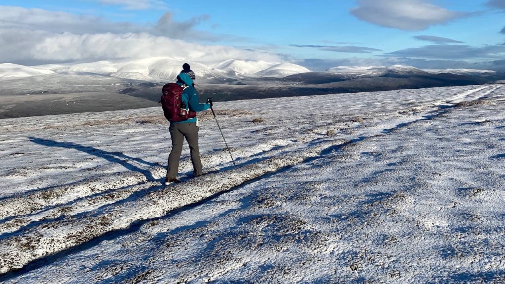 Leaving Carn Liath I hadn’t appreciated how far along the flat plateau I had to go before dropping down. There had been no wind at all on the ascent, but suddenly we were blasted by a cold chilly wind! Despite my three pairs of gloves (liners followed by two other thin pairs) I could feel my hands chilling, and as we moved across the plateau I could feel the cold wind around my lower legs. Bruce suggested stopping to add more clothing if I was cold, but I stubbornly refused thinking I’d be out of the wind soon.