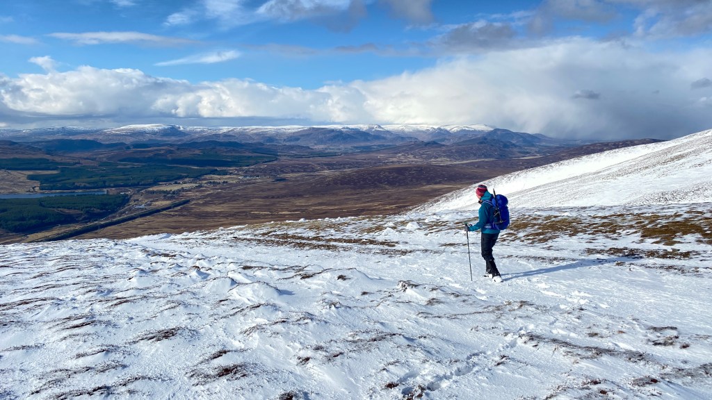 There should have been boggy ground to cross on route to our first munro of the day. However, along with making all the mountains in sight look so much more magical, the bog had disappeared due to the snowy conditions! Instead there was a satisfying crunch on occasion and the odd muttering as we sank into the snow unexpectedly.