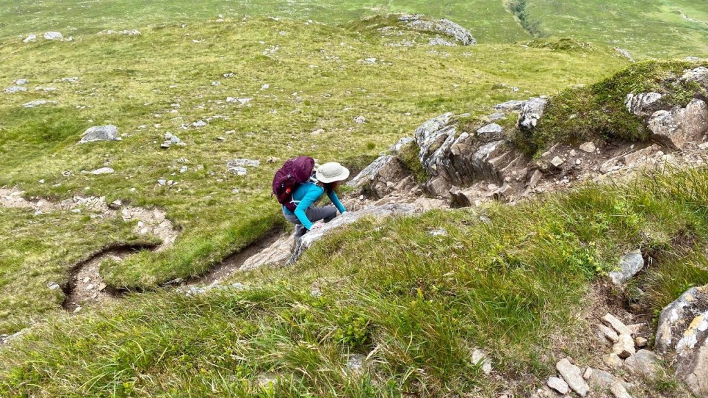 The good zig-zags led to some mildly exposed sections, never my favourite, but the path was good enough to offer reassurance and the steep slopes were grassy. Then we hit the small rocky scramble …