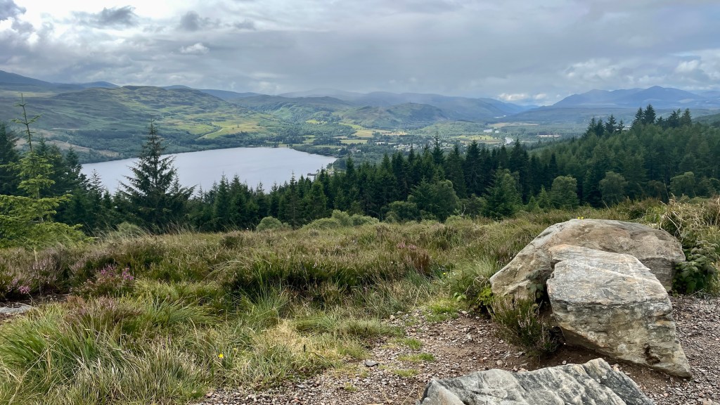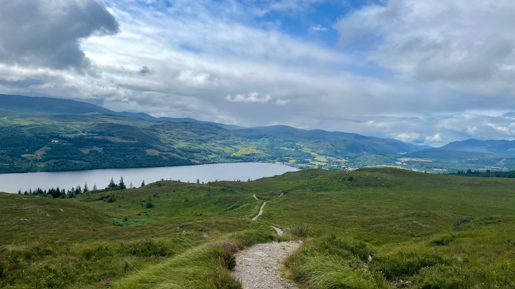 Finally I began to head down steeply with a zigzagging path mimicking that which I’d ascended earlier. A good bit lower, I met a man and his dogs, stopping to chat with them. He was waiting for his wife and laughed when I said I’d chatted to her at length, leaving her blethering to someone else; he may still be there yet!