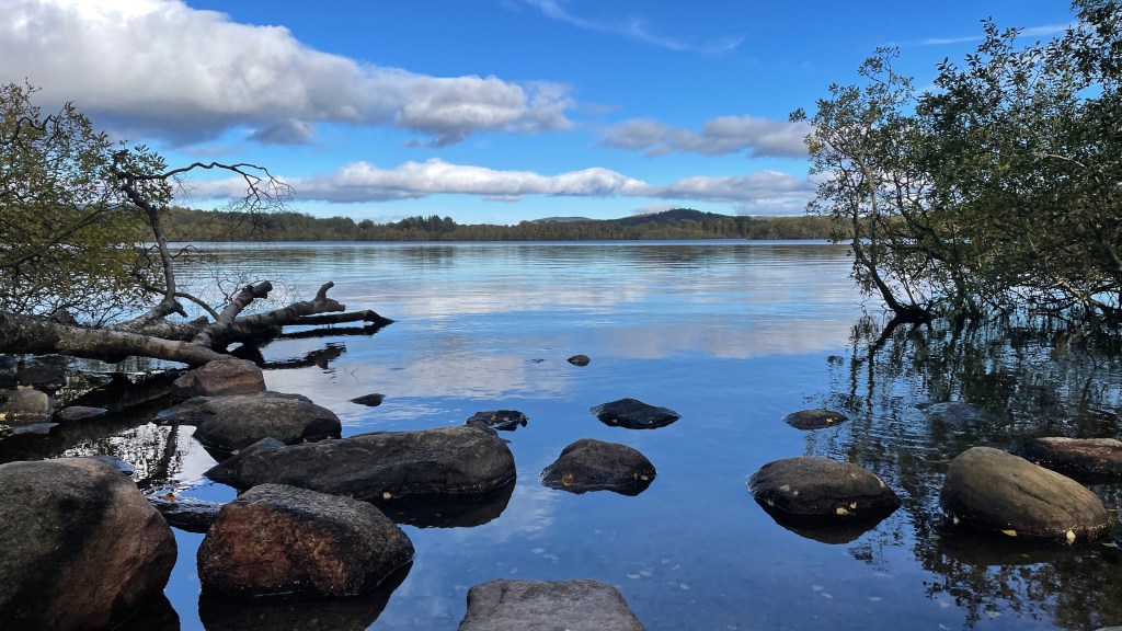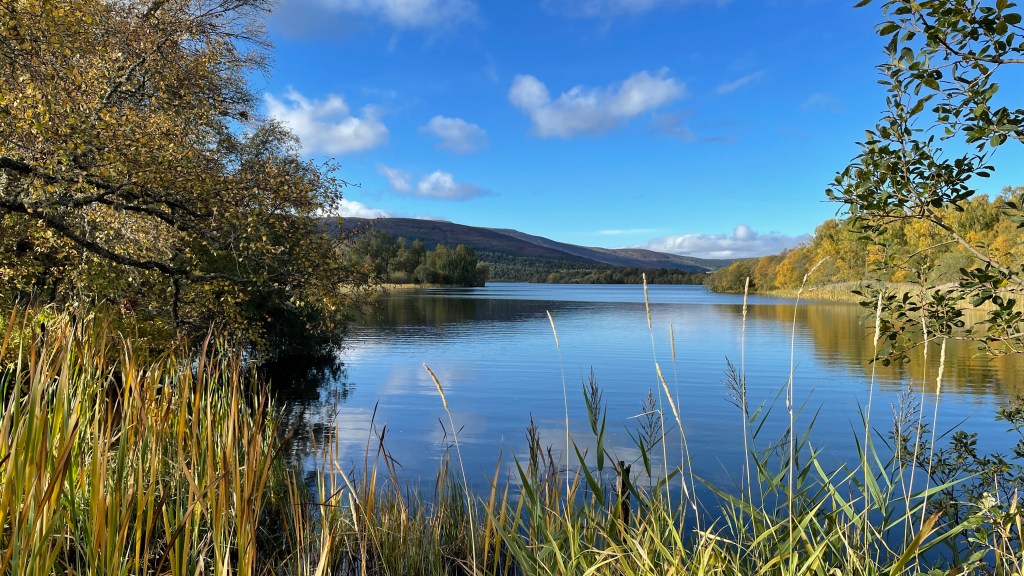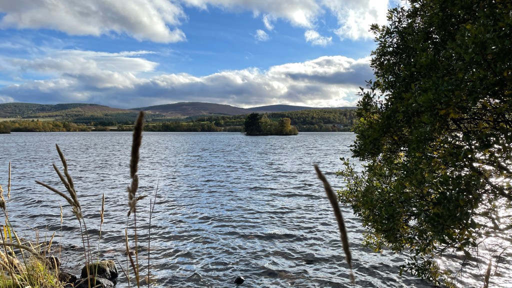 Having parked at the Burn O’Vat car park, after about a mile, we reached the lochside. Here the views across the water were pretty and the sun shone through more, warming me up a little.