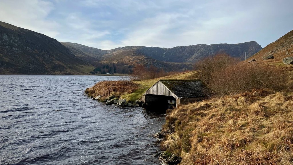 Continuing along, Loch Lee is reached. The wind was blowing down the loch today leading to choppy waters. We contemplated what type of fish might live in the loch. Any ideas?