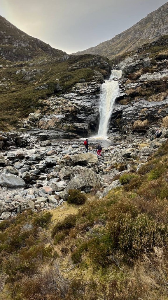 The good track follows the loch and finally leads to a fork where a bridge crosses to lead the track towards the falls. They can be seen for some distance.
