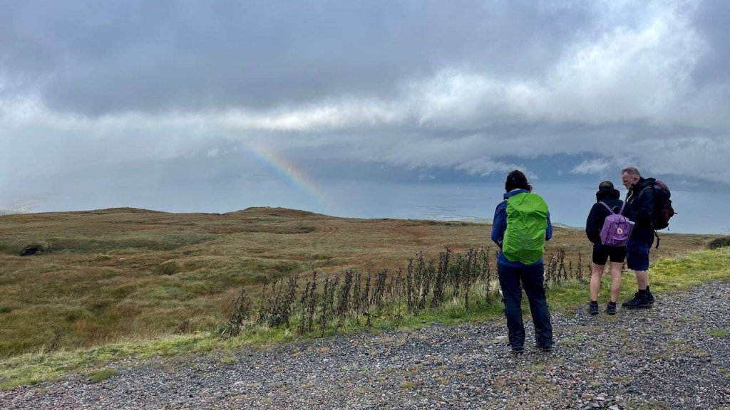 As her imminent arrival was announced we formed a guard of honour with our walking poles and one special friend piped her in. Serious kudos for lugging the bagpipes up the hill and playing on such a driech day!