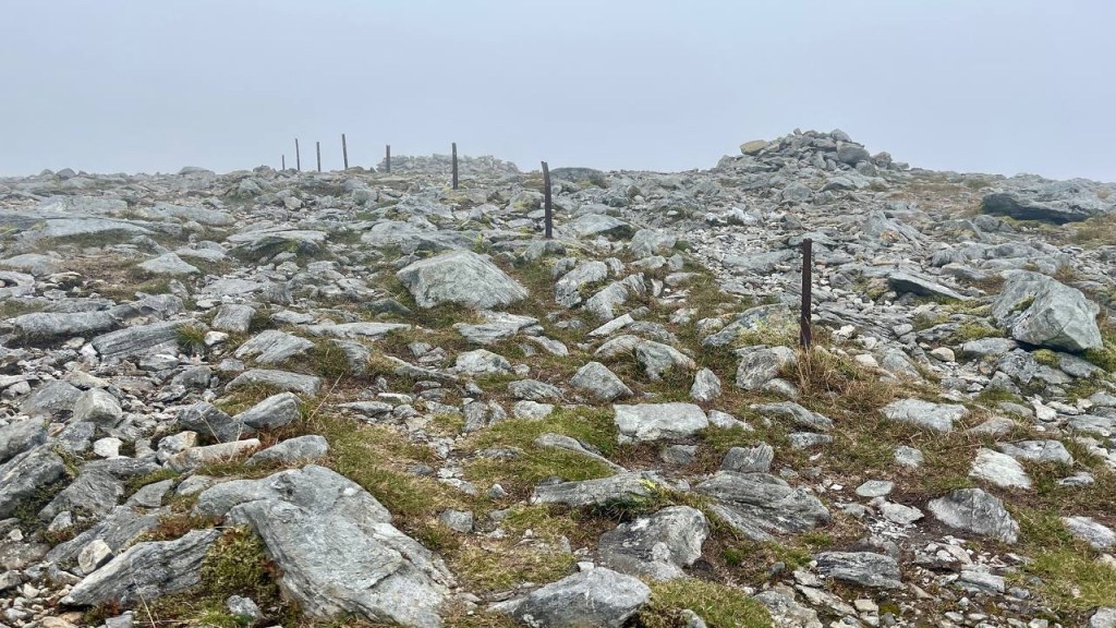 The misty conditions made it difficult to see what was ahead, but the fence posts gave a clear line to follow, useful both on the ascent and in retracing the route back.