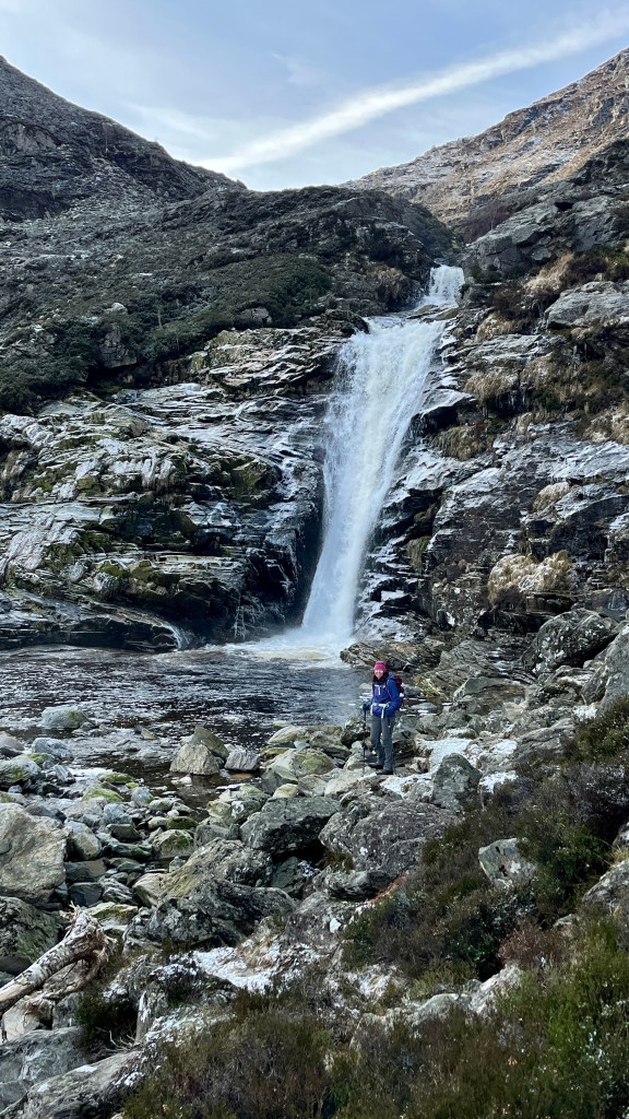The waterfall was flowing well, some of the snow melting higher up with the sunshine. We followed the path up the edge of the waterfall, grateful that this was lightly dusted in snow with very little ice. Our microspikes remained safely ensconced in the rucksacks.