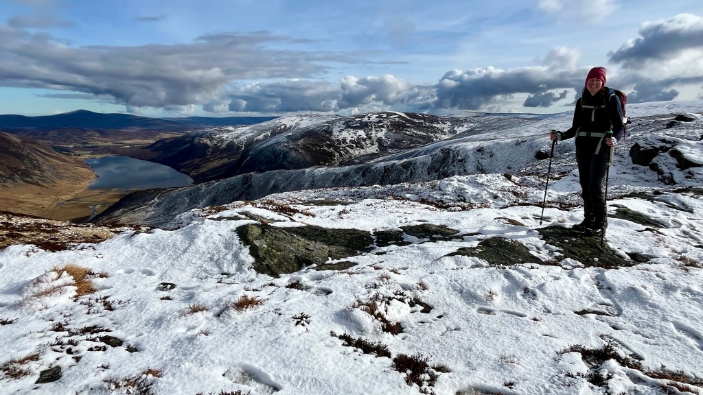 The road was gritted but once out of the car park it became apparent how cold it had been with the full moon and clear skies overnight, the road being rather icy in places. This continued to be a theme along the track towards Loch Lee and we were often clung to the grassy verge to avoid slipping. On the upside, the puddles were iced over to varying degrees and I had lots of fun all the way along the loch side popping them with my walking poles. Some pops were deep, other sounding like glass shattering and a few giving the perfect tone of ‘pop’ to satisfy my sensory need!