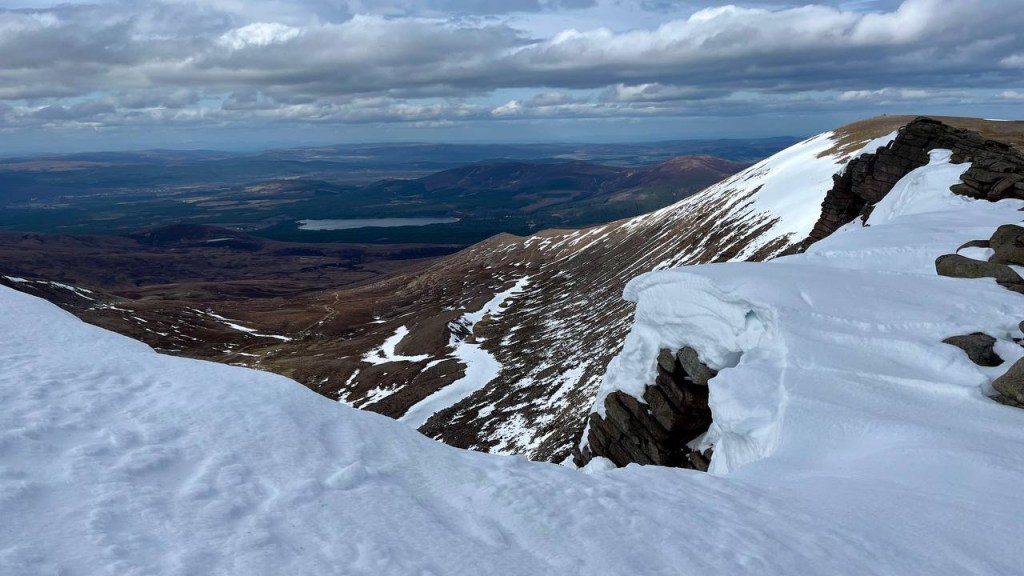 Having crossed the plateau and dropped down a little we were able to admire the cornices heralding the edge of Cairngorm from a safe distance. We met a couple and their dog who was put onto the lead having chased a couple of mountain hares, giving them the fear that she’d inadvertently drop off the side of the mountain!