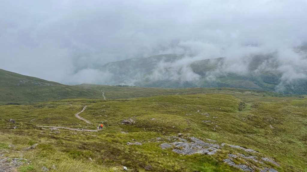 For us, it wasn’t quite as pleasant an experience as it might have been. Everything around engulfed in cloud, the rain continuing to fall, there was little point in stopping and looking back as there was no view to admire. We soldiered on, I pulled my hood tight and focused only on the ground immediately in front of me. Before long we reached the top, and it was still raining.