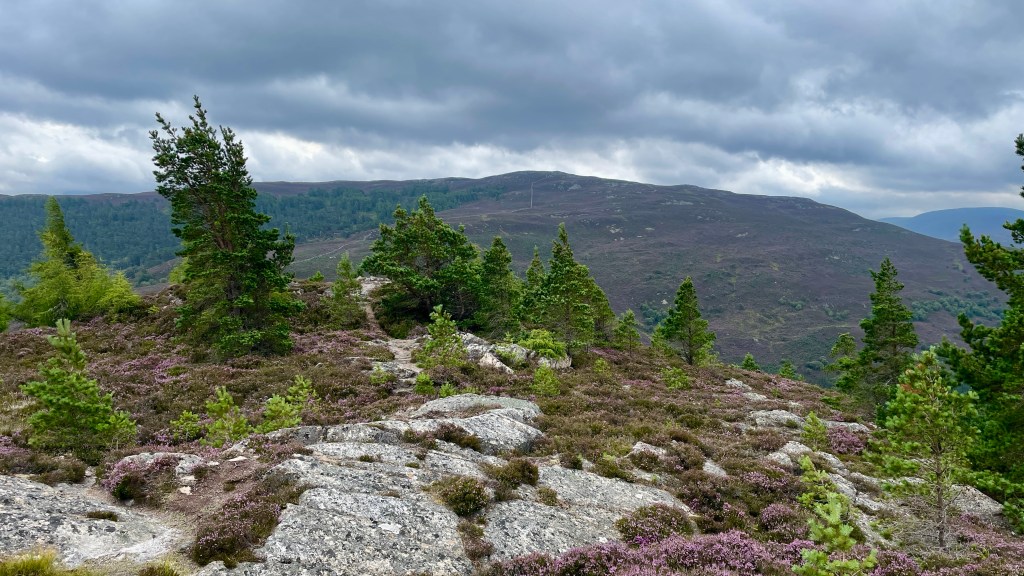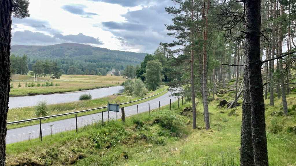Much further along, the path began to climb and it reached the road back from the Linn of Dee. I had a moment of contemplation wondering if I should just follow this back in but thought better of it as there’s no pavement or verge, instead continuing on and up to the duck pond. This did give another bonny view.