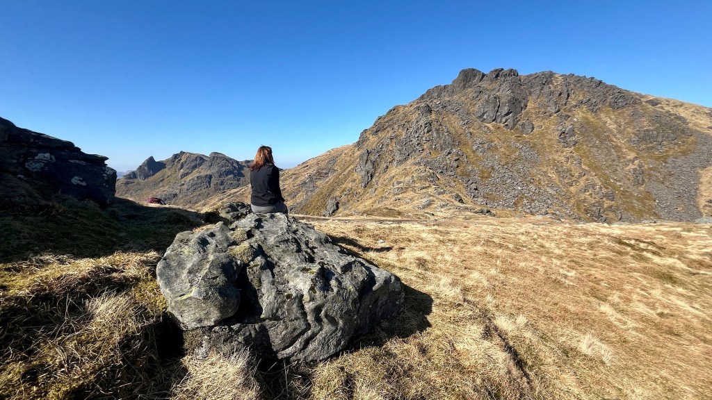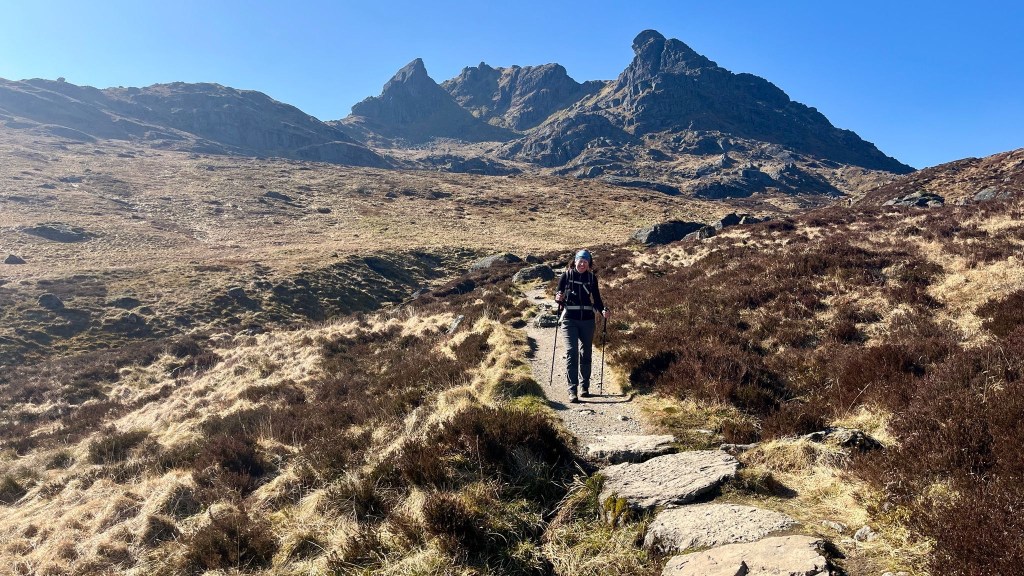 The wind having gotten up a little more, we weren’t keen on hanging around for too long and made our way back on the path we’d come up. There were quite a number of people out and we stopped to chat to them as they headed uphill. Although quick, the descent felt long and we were glad to reach the decent path that would take around Beinn Narnain, avoiding the need to go back up and over.