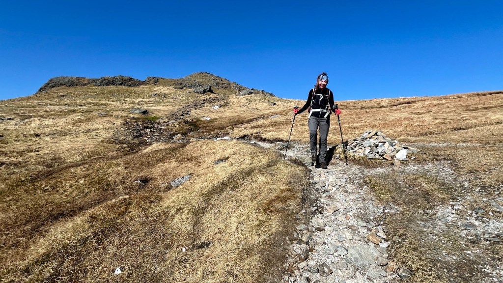 Off we went, a path leading us up. There were a few wee scrambly bits through rocky patches and I was glad that I’d stashed my poles in my rucksack to give me free hands to hold on and provide a bit of extra security. The upside of this path was that it came and went, zigzagging a bit here and there, never with too great exposure so any steeper sections still felt quite safe. Before long we were at the top and I was quite delighted with myself, grateful of Bruce’s support on route up. For once, this being a special day for us, we got a photo together.