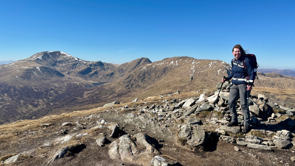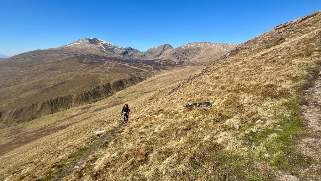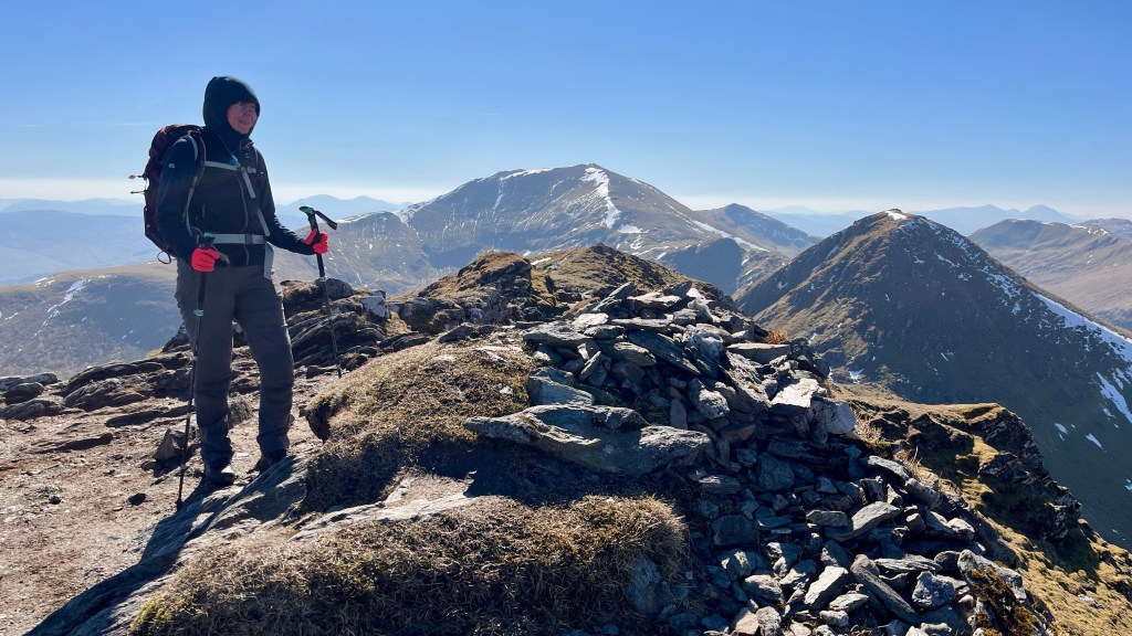 Reaching Meall Garbh, our highest summit of the day at 1123 metres, we wandered a wee bit further along the path to view An Stuc but it didn’t tempt me. We could see a path to a certain point but it was unclear where it went beyond this. By this point it was pretty blustery too, all the less appealing for doing something challenging.