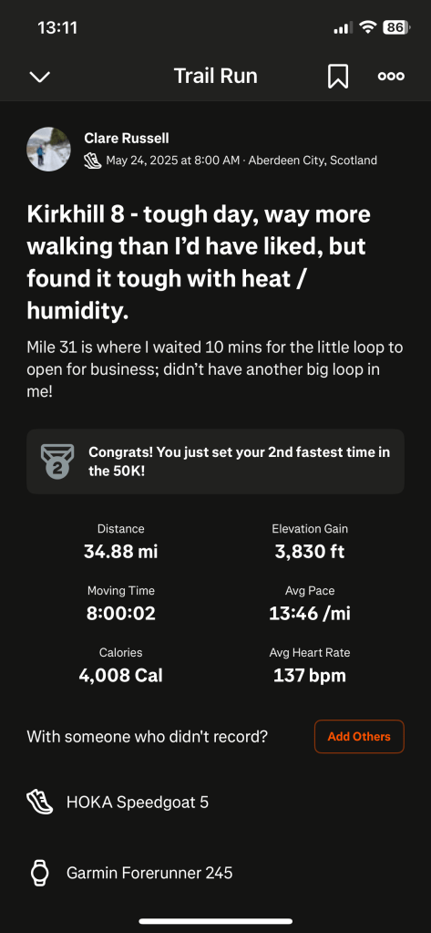 My main goal was more than a marathon and I most definitely achieved this. While not quite hitting last year’s distance, I feel that I had a good race in the conditions, so all things considered, I’m chuffed with my day out.