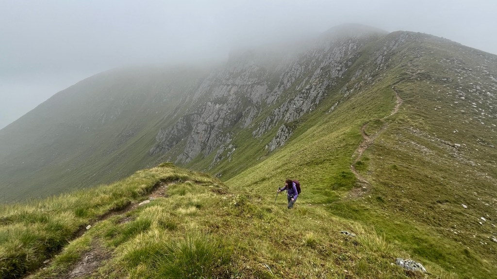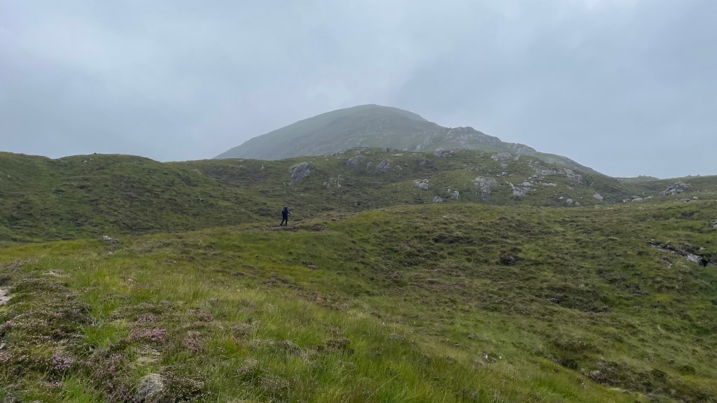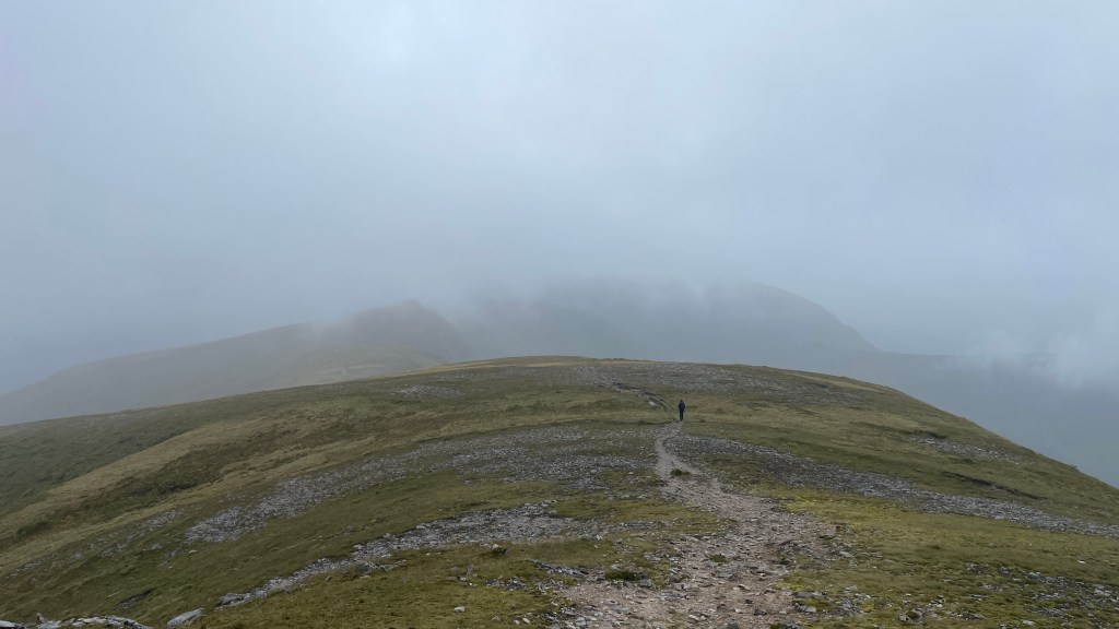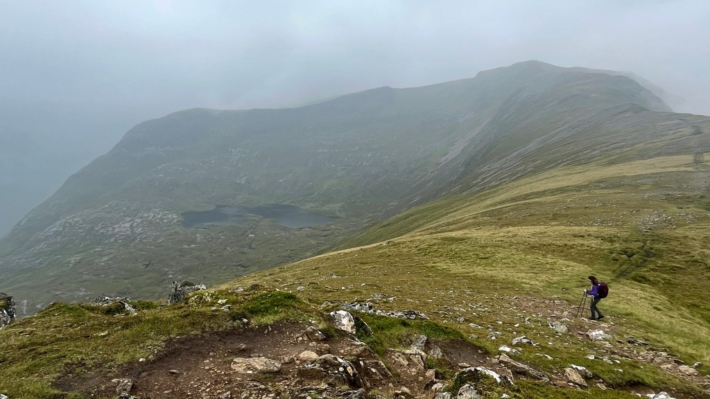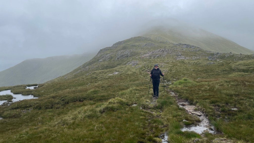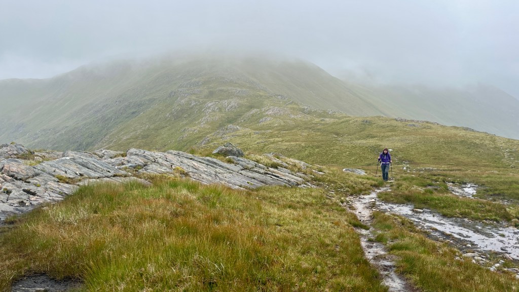 With four munros in the bag, I was excited to continue on to see what was ahead. The legs were feeling pretty good, all was well with the feet, and our only gripe was that the cloud was stubbornly hanging around, impacting on the views. The next munro looked large in the distance.