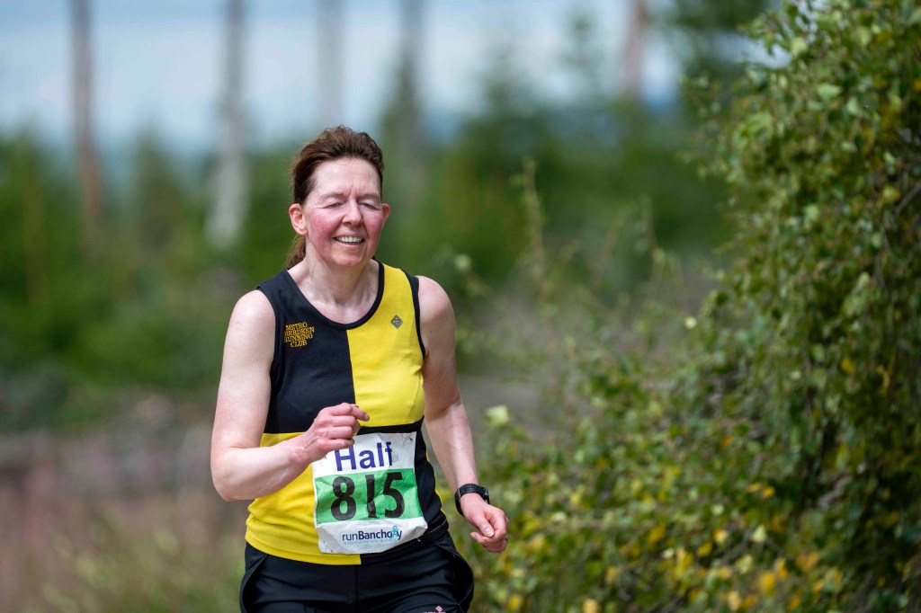 We lined up at the start, the run briefing was given, and we were off, round the field and out onto the closed road across the bridge and the River Dee. We then began the gentle climb up the road towards Scolty, taking a right and continuing on the low road rather than heading up to the woodland car park itself. The road section lasted around 6 km if I recall correctly.