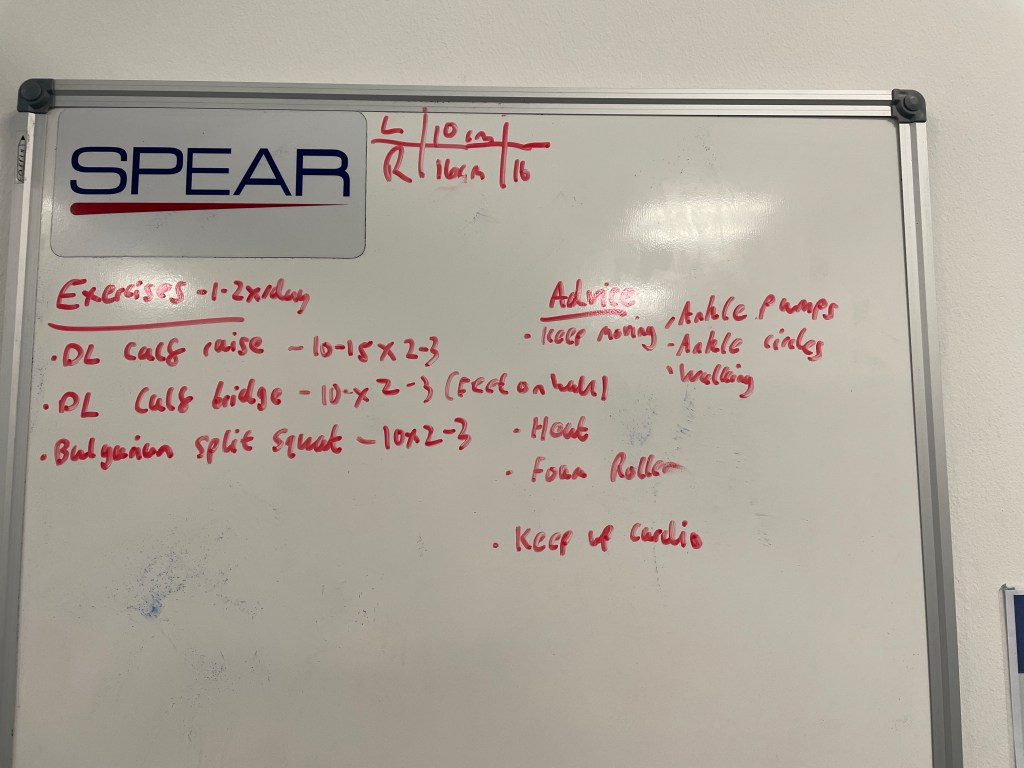Struggling to lift my toes up or walk without pain, I was happy to secure a physio appointment online for first thing on Monday morning at Spear Physiotherapy. There I met Stefan who advised that I had a Grade 2 tear, advice being that in 3 weeks time I might be able to run, however this was dependent on the speed of recovery. I made the decision at this point that attempting a trail marathon would be unwise, worse case scenario a recurrence of the injury would mean others having to come to my rescue. Accommodation cancelled, the decision was made.