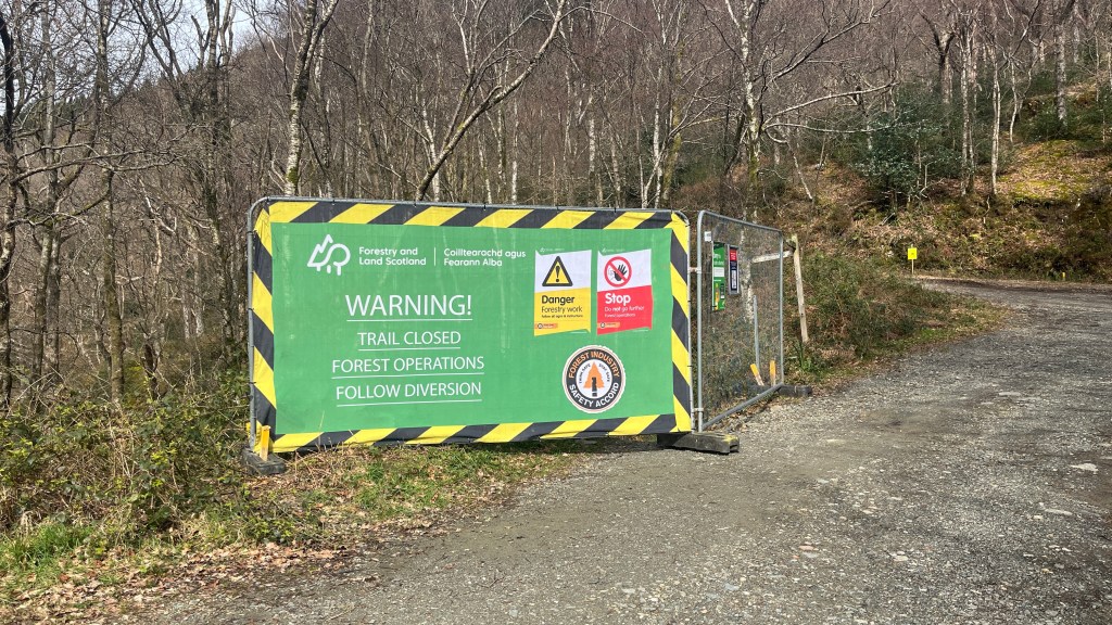 We were forced onto the high route due to a path closure on the low route. Unlike our local forestry signs in the Aberdeenshire area there was no mistaking this message! This is an easier path, following a good track / fire road, but climbs higher.