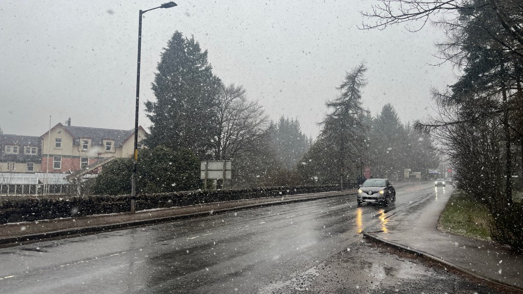 Heading across the road to the bus stop the chill in the air could be felt, a stark difference to yesterday. As we got closer to Tyndrum, the sky darkened and the windscreen got spattered. By the time we pulled up in Tyndrum, we were in the midst of a mini blizzard! We stopped in the bus shelter to put our waterproofs on before going any further. The buses had converged here to transfer passengers, the drivers comparing photos of last night’s snow in Glencoe.