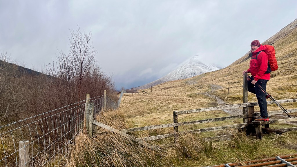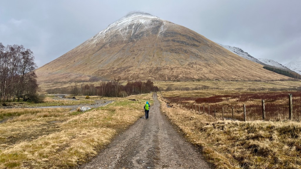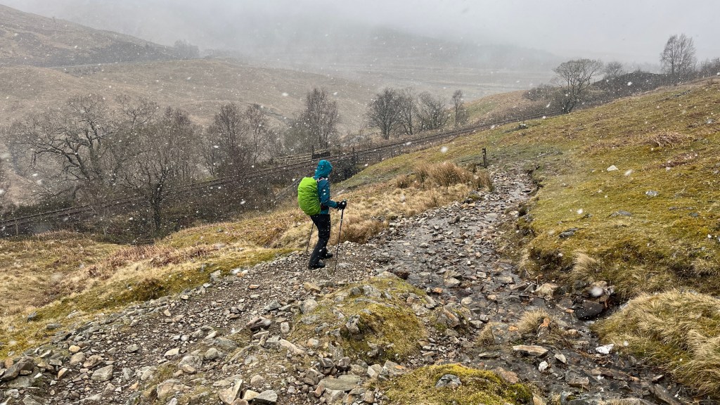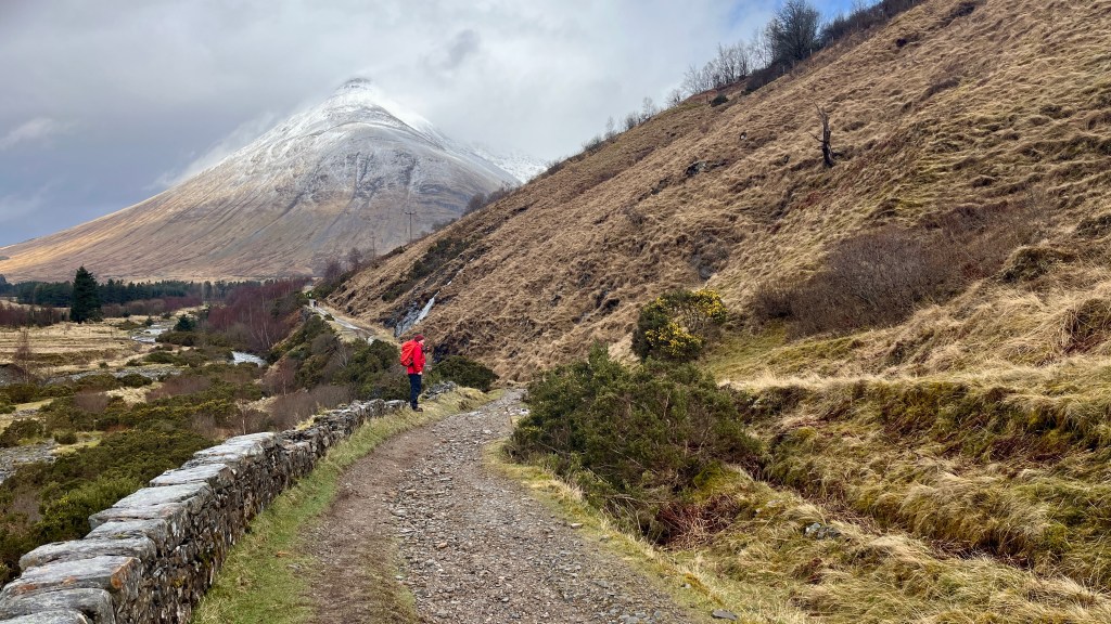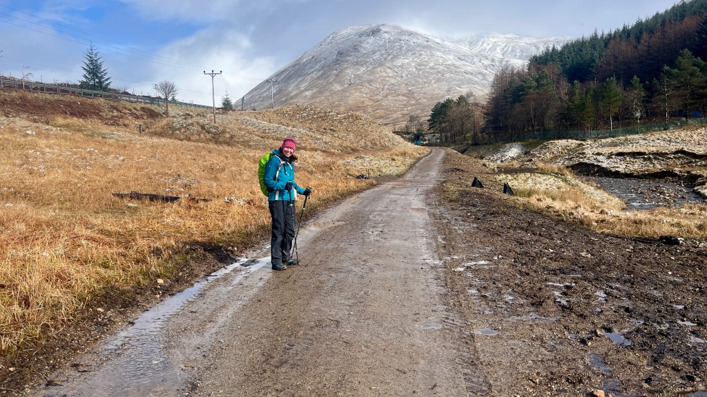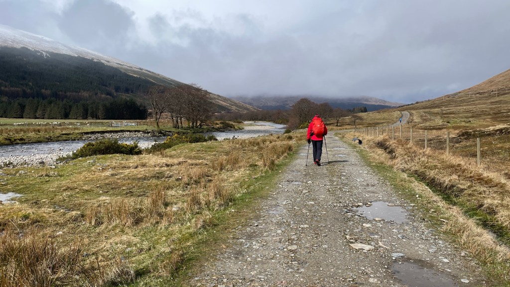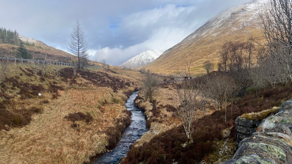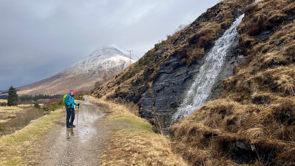 After a good night’s sleep at Bridge of Orchy and the best breakfast of the Way thus far (scrambled eggs and smoked salmon), we caught the bus back along to Tyndrum to walk back past Bridge of Orchy again on route to Inveroran. This was our planned hill day but due to a fair bit of snow overnight and the weather forecast prior, we’d binned that plan; on the upside, Storm Dave seemed to have passed us by.
