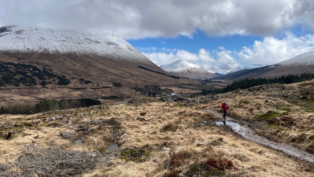Thereafter we had a wonderful Scottish weather experience of snow, sleet and hail; a wonderful facial of hailstones, joyous! The views were largely obscured at this point, but as we descended to Inveroran the sky began to clear and the sun broke through once again.