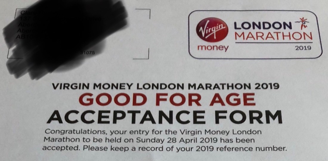 I blogged a wee while back about having been accepted with a Good For Age time for the London Marathon in 2019. It’s been in the back of my mind as that’s the first training target for next year - keep plodding through the winter in order to hopefully make the start line in half … Continue reading Exciting Times!